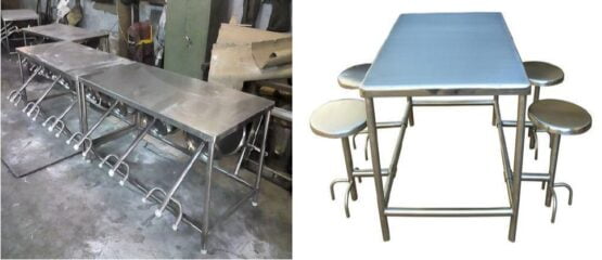 • It is SS Canteen Table attached with 04 Nos. Stool for sitting purpose which can be fold easily inside after the completion of eating. Down on Legs it’s provided Adjustable Nylon Bush, so it is easy to move from one place to another.